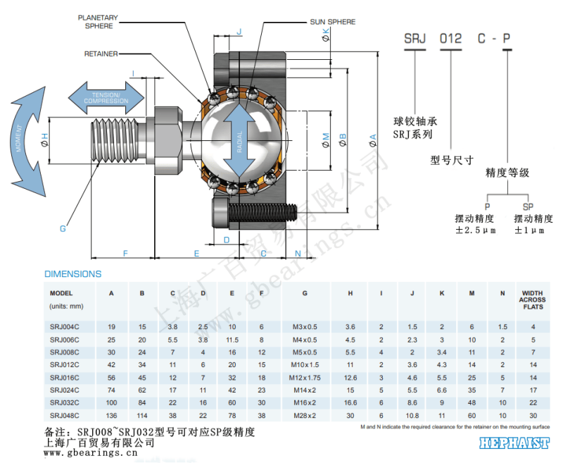 SRJ048C廠家 SRJ024CP球鉸軸承 SRJ048CP萬向球頭軸承 HEPHAIST品牌
