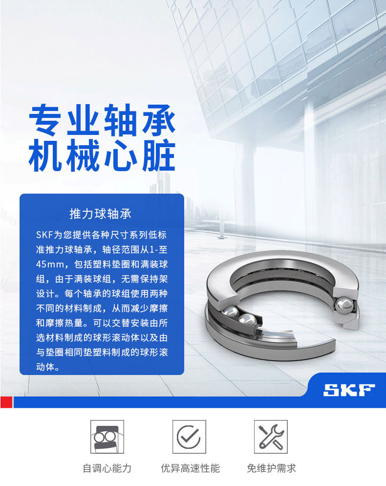 SKF推力球軸承是一種分離型軸承,軸圈、座圈可以和保持架、鋼球的組件分離。軸圈是與軸相配合的套圈,座圈是與軸承座孔相配合的套圈,和軸之間有間隙。